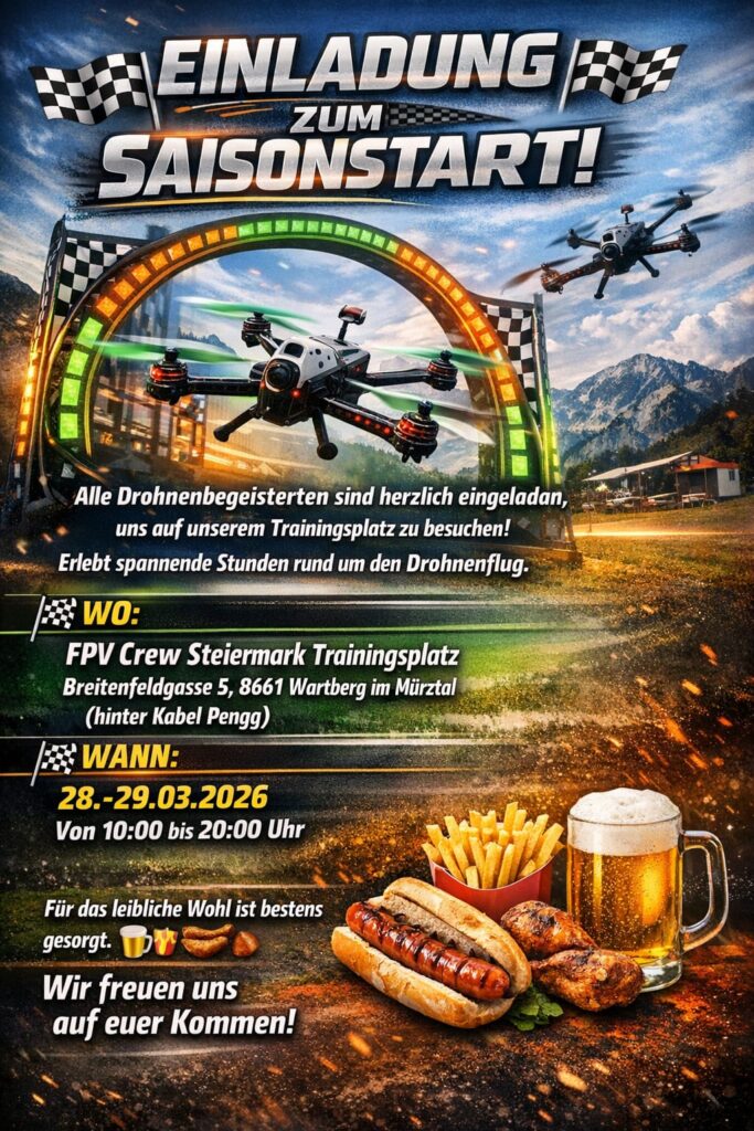 FPV Crew Wir laden euch recht herzlich zum FPV Drohnen Saisonauftakt 2024 ein! 3. April 2024 Patz Schreibe einen Kommentar Wo: FPV Crew Track WartbergWann: 13.4 ab 10:00Vormittag: Freies FliegenNachmittag: Freies Fliegen und Funrace Für leibliches Wohl ist gesorgt! Besucher sind recht herzlich willkommen!